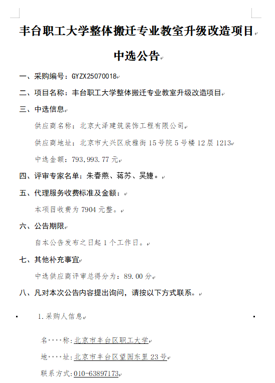 丰台职工大学整体搬迁专业教室升级改造项目中选公告