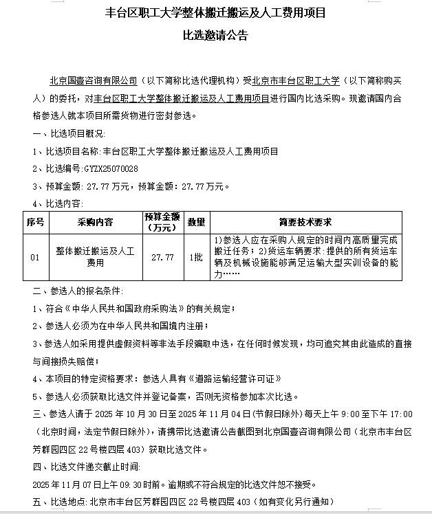 丰台区职工大学整体搬迁搬运及人工费用项目比选邀请公告