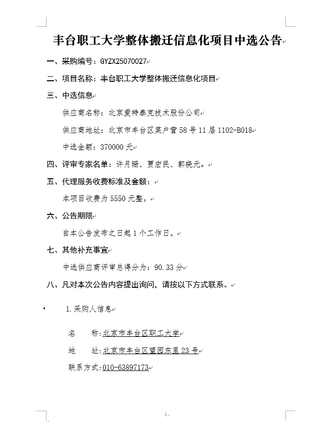 丰台职工大学整体搬迁信息化项目中选公告
